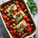 This Baked Cod with Tomatoes, Olives & Capers is a flavorful Mediterranean-inspired dish that is both heart-healthy and easy to prepare. Tender cod fillets are topped with a vibrant mixture of cherry tomatoes, Kalamata olives, capers, garlic, and herbs, then baked to perfection. Ideal for a nutritious weeknight dinner, this recipe is naturally gluten-free and low in saturated fat.