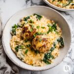 This Baked Lemon Rosemary Chicken Meatballs with Creamy Orzo is a flavorful, hearty meal perfect for a comforting dinner. Juicy meatballs infused with lemon zest, rosemary, and Italian spices are baked alongside orzo pasta cooked in white wine and cream, finished with fresh spinach and melted cheese for a luscious, one-dish feast.