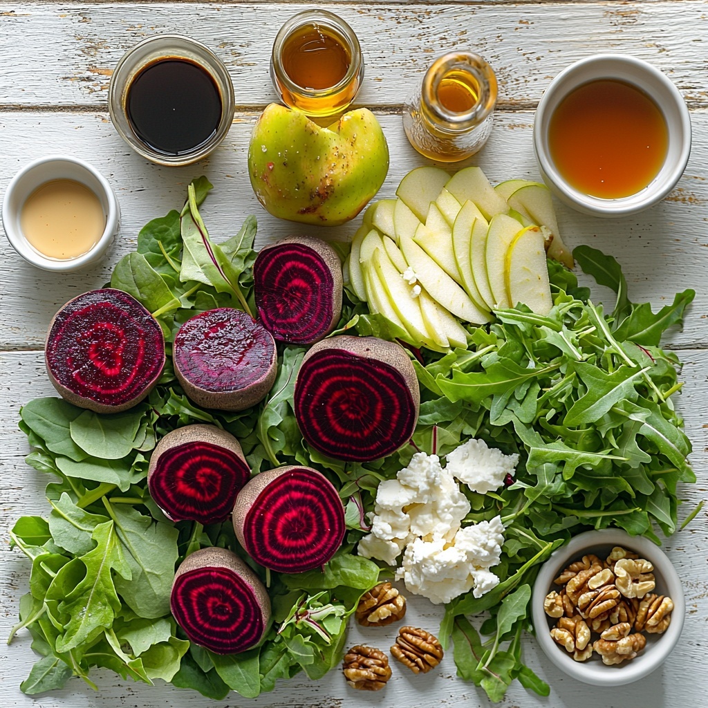 A vibrant and healthy beet salad featuring roasted beets, crisp apples, peppery greens, tangy goat cheese, and toasted walnuts, all brought together with a flavorful balsamic vinaigrette. This salad is perfect as a light lunch or a side dish, balancing sweetness, acidity, and earthy flavors.