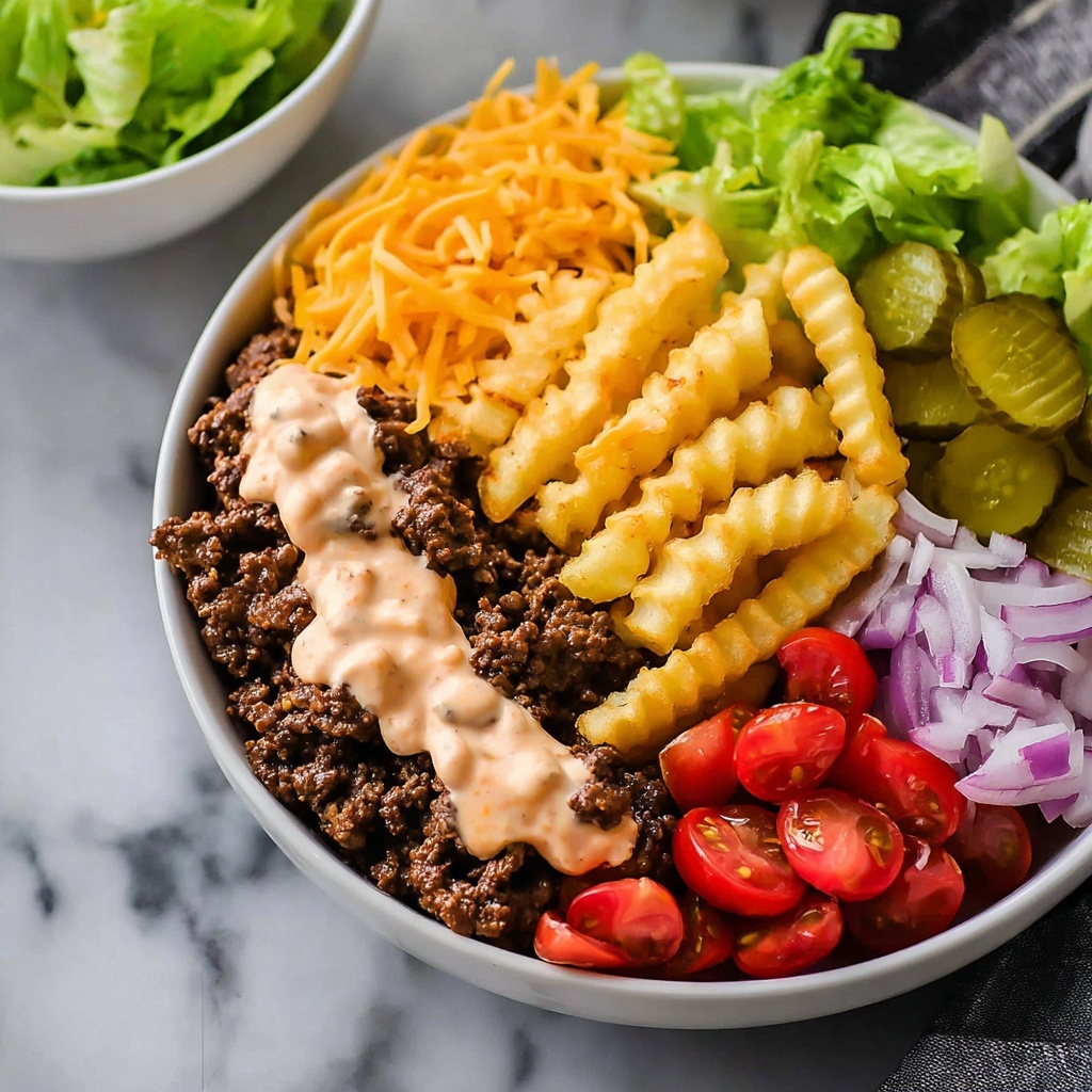 A delicious and easy-to-make cheeseburger bowl recipe featuring seasoned ground beef, fresh veggies, shredded cheddar, and a creamy copycat Big Mac sauce. Perfect for a low-carb meal that packs all the flavors of a classic cheeseburger without the bun.