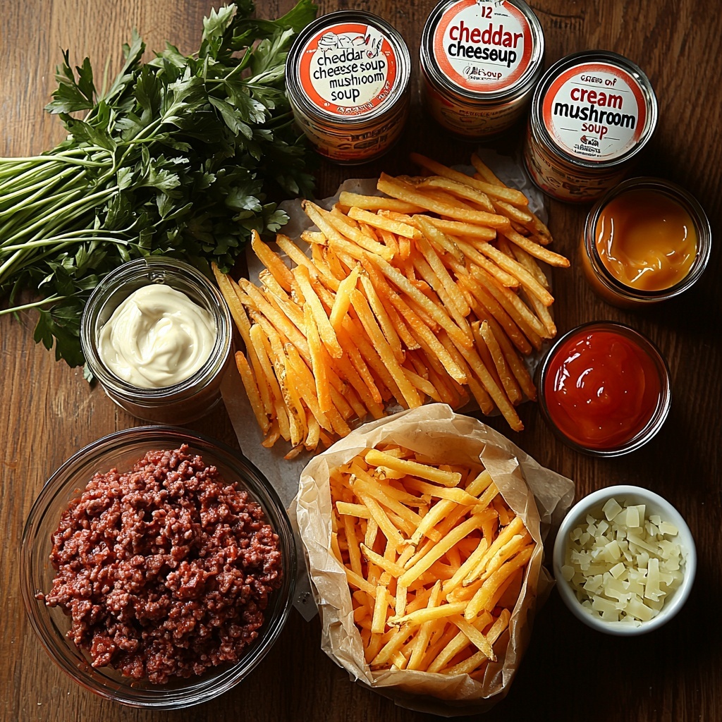 The magic of this Cheeseburger French Fry Casserole Recipe lies in its straightforward ingredients that each play a vital role. Every component adds layers of flavor, texture, or that perfect pop of color that makes this dish so inviting and irresistible.