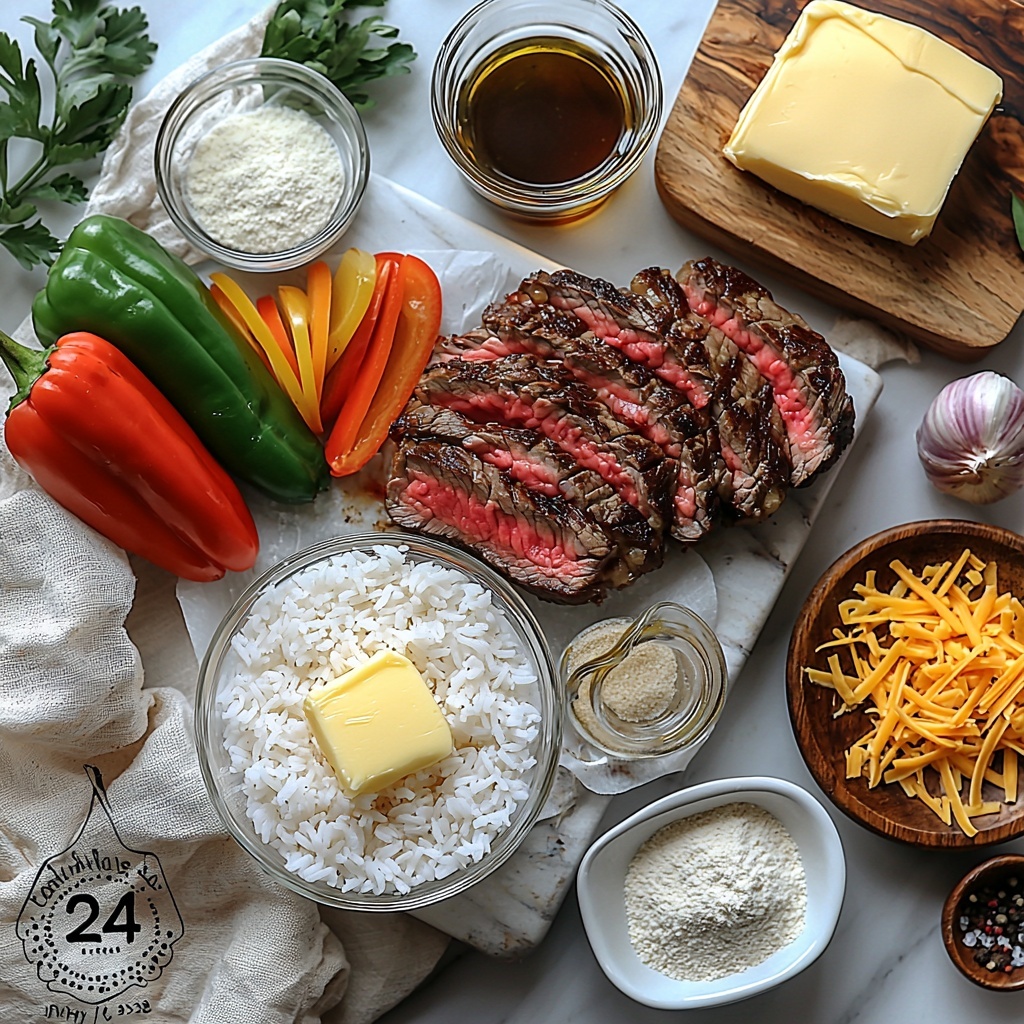 This Cheesy Steak and Rice Skillet Recipe is built on simple ingredients that pack a punch. Each item plays an essential role, from the jasmine rice’s fluffy texture to the sharp cheddar’s rich melt that envelopes the dish in creamy goodness. Let’s dive into the essentials that’ll bring this skillet to life.