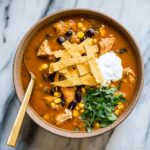 This hearty and flavorful Chicken Enchilada Chili combines the smoky richness of enchilada sauces with tender, seasoned chicken, black beans, and corn for a delicious, comforting meal. Creamy cheese and sour cream add a smooth finish, while crispy homemade tortilla strips provide the perfect crunch. Ready in just 30 minutes, this chili is perfect for a satisfying weeknight dinner.