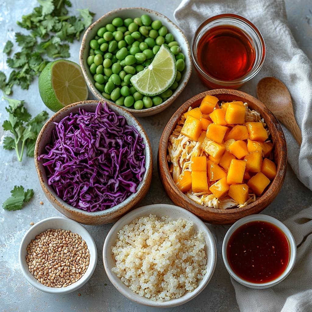 Now for the fun part—layering all the vibrant ingredients! In each of the four serving bowls, create a base by shaping the cooked quinoa on one side in a lovely crescent moon form. Then, add generous portions of 2 1/2 cups cooked shredded chicken, 1 1/2 cups finely shredded purple cabbage, 1 1/3 cups warm shelled edamame, and 1 cup chopped mango. The layers build a stunning contrast of colors and textures that is as delightful to look at as it is to eat.