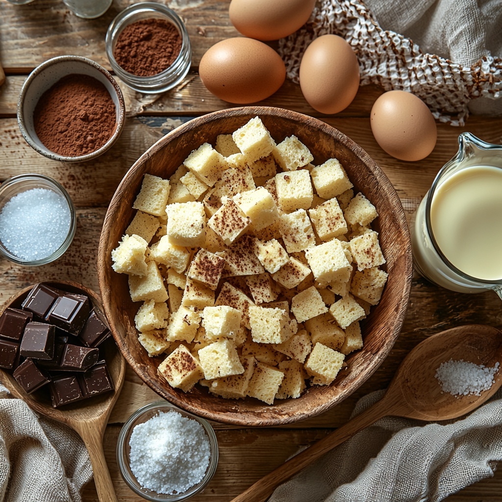 5. Combine Mixtures: Pour the custard mixture evenly over the bread cubes. Gently press down to ensure the bread absorbs the flavors and custard thoroughly.