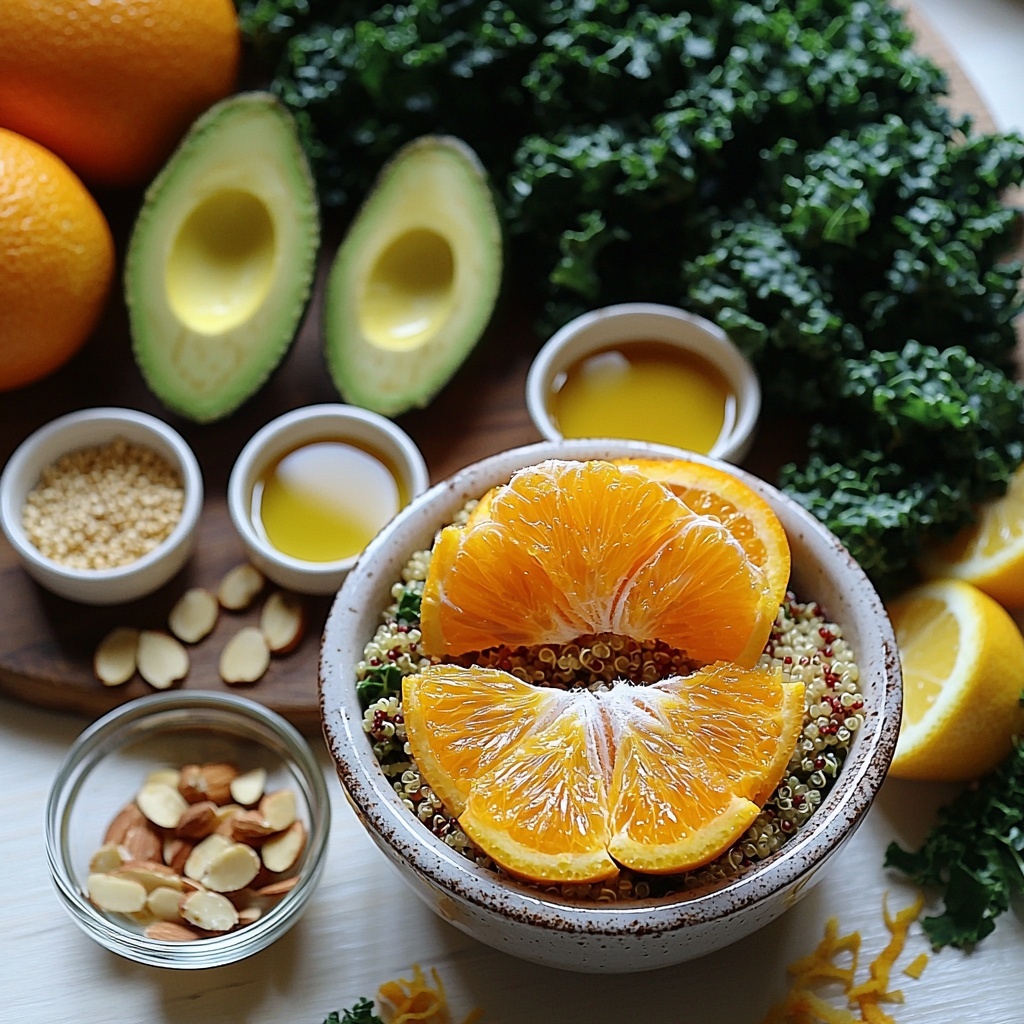 The magic of this Citrus-Infused Quinoa Salad with Oranges and Kale Recipe lies in its simple, wholesome ingredients. Each one plays a key role—whether it’s adding texture, color, or a burst of flavor—resulting in a beautifully balanced and inviting salad.
