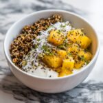 A refreshing and nutritious Cottage Cheese Pineapple Granola Bowl perfect for a quick breakfast or light snack. This recipe combines creamy low-fat cottage cheese with sweet pineapple, crunchy granola, and wholesome toppings like chia seeds and shredded coconut, finished with a touch of honey or maple syrup and fresh mint for a delightful balance of flavors and textures.