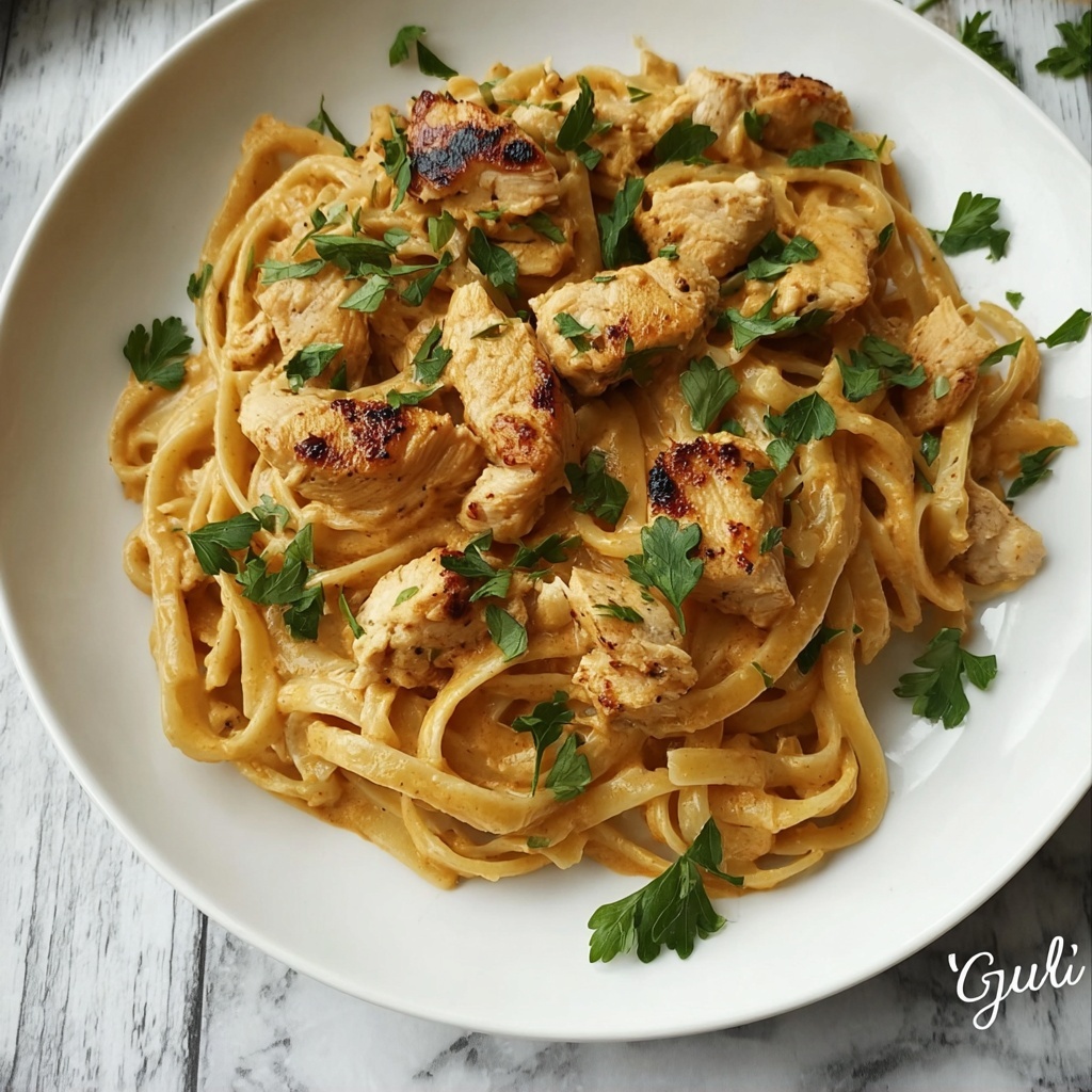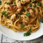 5. Garnish and serve: Sprinkle freshly chopped parsley over the top for color and fresh flavor. Serve the Cowboy Butter Chicken Linguine hot immediately.