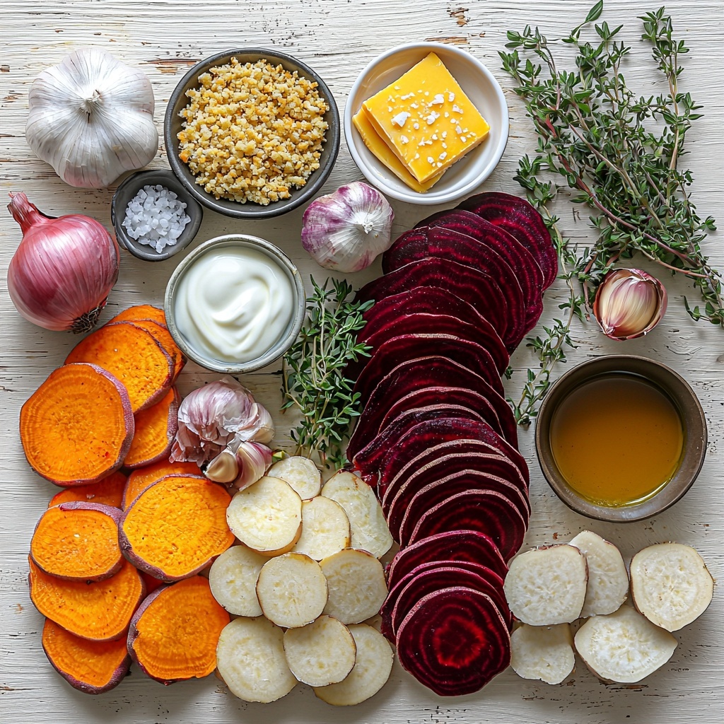 - Layer vegetables: In a mixing bowl, toss the thinly sliced beets, parsnips, onion, garlic, and optional sweet potato or carrot with salt, pepper, and a small amount of olive oil. Arrange the vegetables evenly in the baking dish, alternating colors for an attractive presentation if desired.