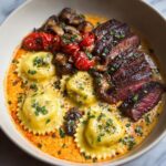 This Creamy Tomato Mushroom Ravioli with Seared Steak is a delightful fusion dish combining tender cheese-filled ravioli in a rich, creamy tomato sauce with sautéed mushrooms, bell peppers, and zucchini. Topped with perfectly seared, juicy steak slices and garnished with fresh herbs and Parmesan, it offers a balanced and indulgent meal perfect for a comforting dinner.