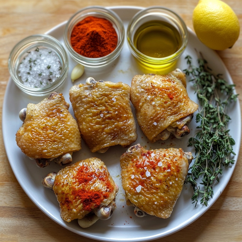 For a casual dinner, serve the chicken thighs straight from the platter with sides on the side. For a more elegant touch, plate each thigh on a bed of fluffy couscous or quinoa, topped with herbs and a drizzle of lemony yogurt sauce. Either way, serving this dish warm ensures the crispy skin stays delightfully crunchy.
