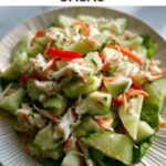 Store any leftover salad in an airtight container in the refrigerator. It will keep nicely for up to two days, though it’s best enjoyed fresh so the cucumbers stay crisp and the crab remains tender.