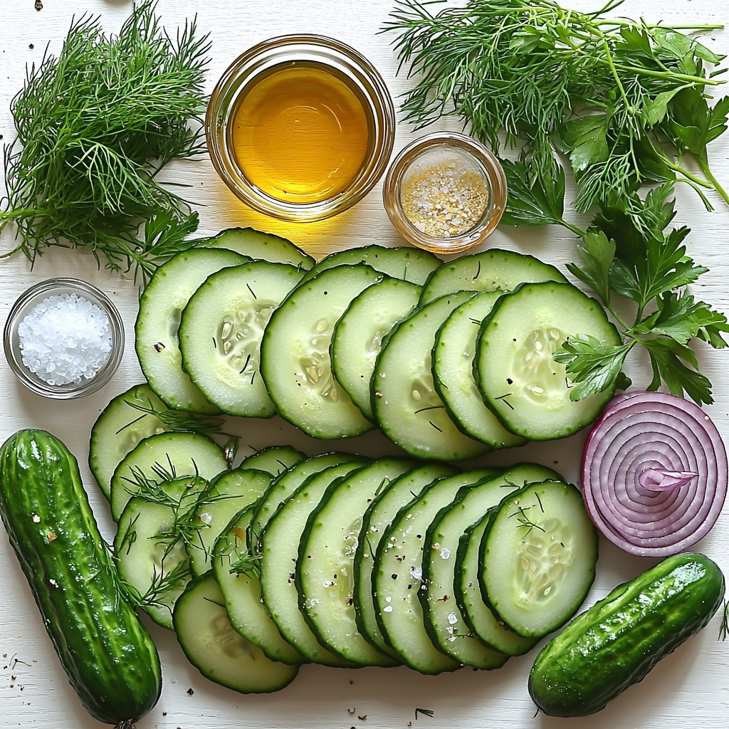This refreshing cucumber salad combines thinly sliced cucumbers and red onions tossed in a tangy vinegar and olive oil dressing, enhanced with herbs like dill and optionally parsley or mint. Perfect as a light side dish, it balances crisp textures with bright, zesty flavors for an easy, quick-to-prepare salad that’s ideal for warm days or as a complement to heavier meals.