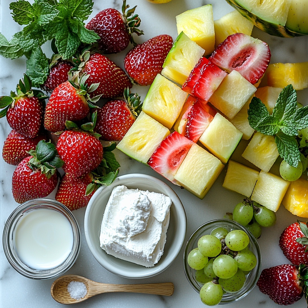 Fruits like strawberries, apple slices, grapes, pineapple, and melon are favorites because their natural sweetness and texture pair beautifully with the creamy dip.