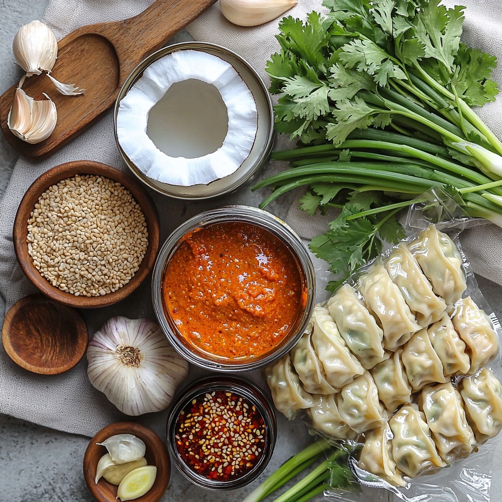 The magic of this Easy One-Pan Dumplings Recipe lies in its simple yet essential ingredients. Each one plays a key role in building layers of flavor—the creamy coconut milk provides a smooth base, while red curry paste delivers just the right kick of warmth. Fresh garlic and ground ginger add aromatic complexity, and the soy sauce balances everything with a touch of umami.
