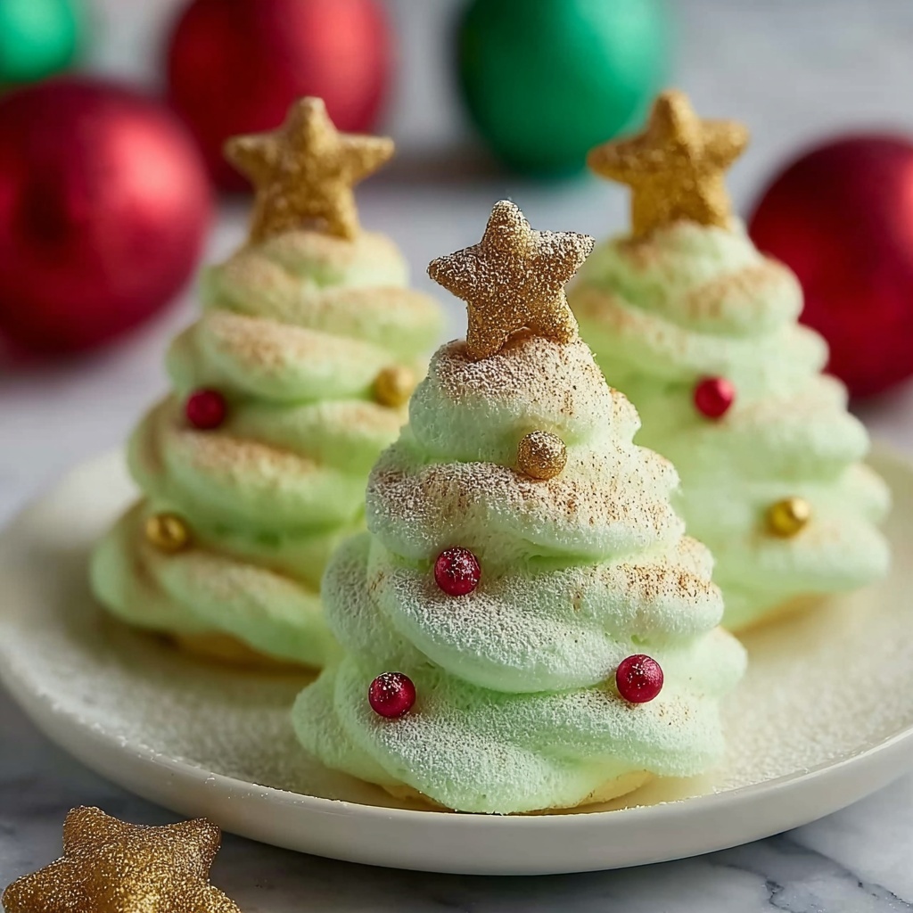 Festive Meringue Christmas Trees are light and airy whipped egg white treats, delicately flavored with vanilla or peppermint and tinted green with gel food coloring. These elegant, crisp meringue swirls are piped into tree shapes, decorated with colorful holiday sprinkles and edible gold stars, making them a perfect festive dessert or decoration for your holiday celebrations.