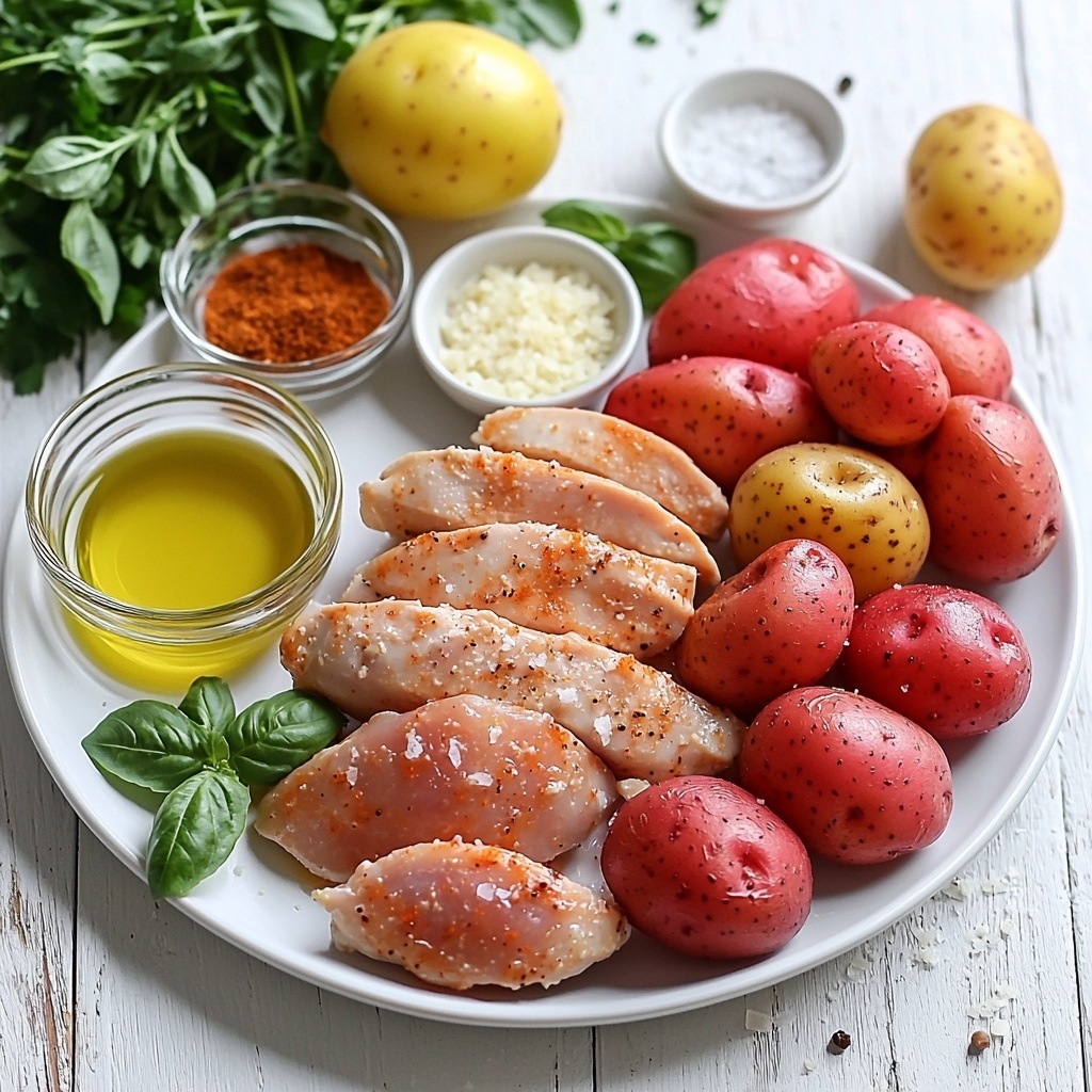 Next, scatter the halved or quartered baby red potatoes on top of the chicken. Use a spoon or spatula to gently stir the potatoes into the marinade and juices. This ensures that those baby potatoes soak up the zesty, garlicky goodness, resulting in a wonderfully hearty and flavorful combination.