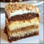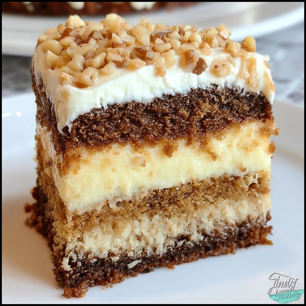 This White German Chocolate Cake features a rich and moist chocolate cake layered with a creamy cheesecake center and topped with a smooth German chocolate frosting. Perfect for chocolate lovers looking for a decadent dessert with a luscious filling and frosting.