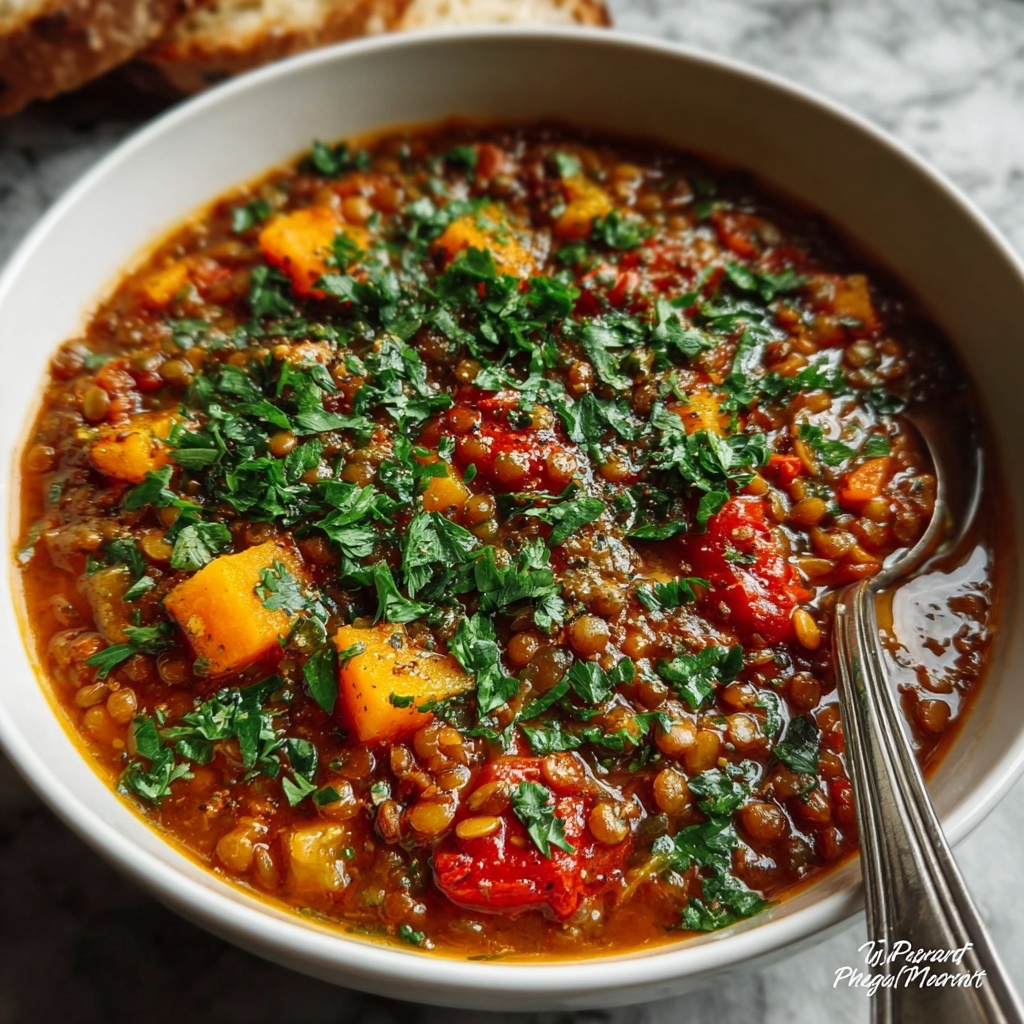 A hearty and flavorful Harissa Lentil Stew combining protein-rich red lentils with aromatic spices, creamy coconut milk, and vibrant greens. This warming dish is perfect for a nutritious weeknight dinner and serves 8 people.