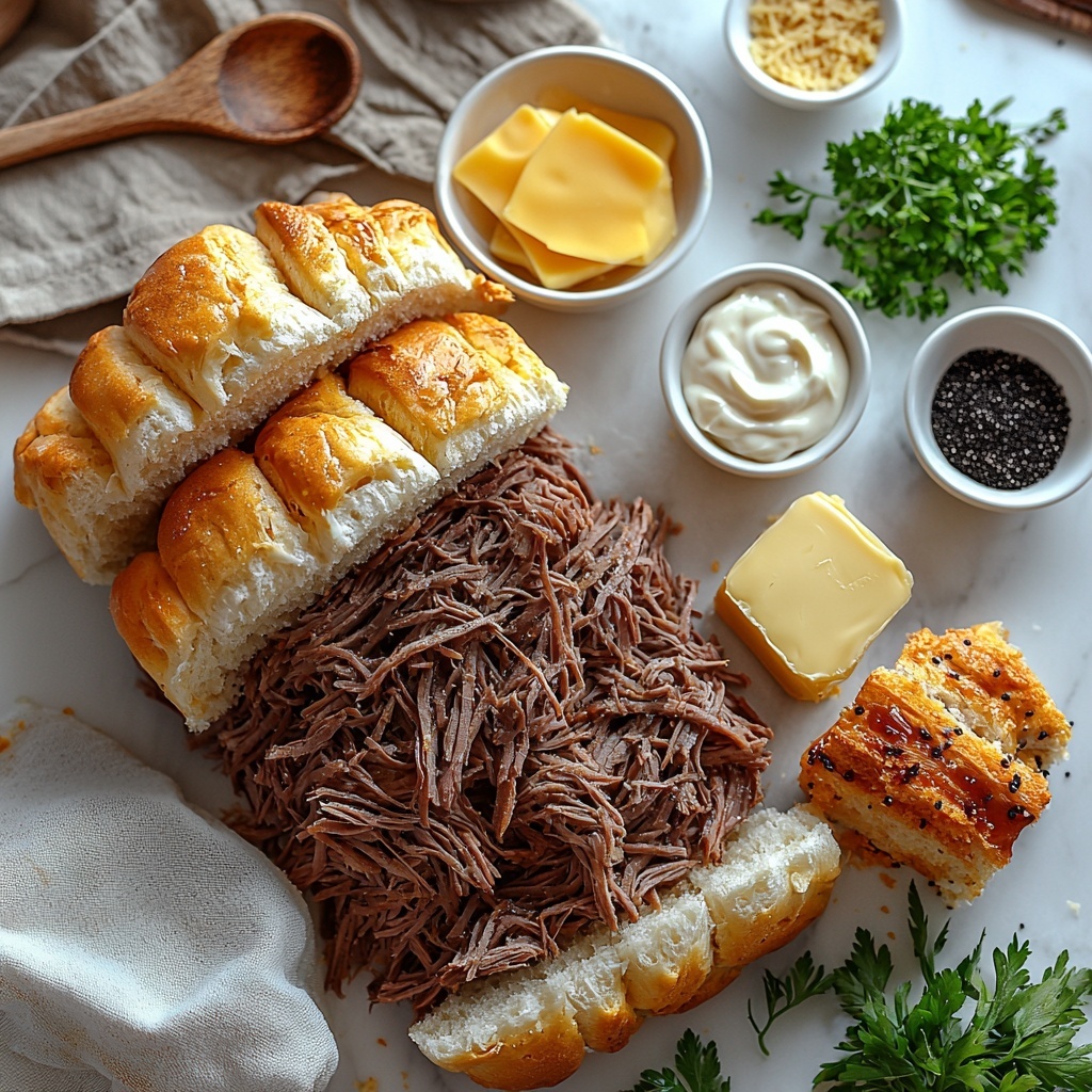 Now comes the meaty magic: pile the shredded roast beef over your garlic mayo layer then lay down 12 slices of American cheese on top. This combination will melt together beautifully during baking, creating the ooey-gooey center everyone will love. Finally, place the top half of the buns back on to complete the sandwich.