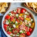 Italian Cowboy Caviar is a vibrant, fresh, and flavorful no-cook Italian-inspired salad featuring grape tomatoes, fresh mozzarella, white beans, pepperoncinis, and a zesty Italian dressing. Perfect as a dip or appetizer served with crostinis, pita chips, or crackers, this dish combines creamy mozzarella and crunchy pine nuts with a bright lemony dressing for a crowd-pleasing, easy-to-prepare recipe.