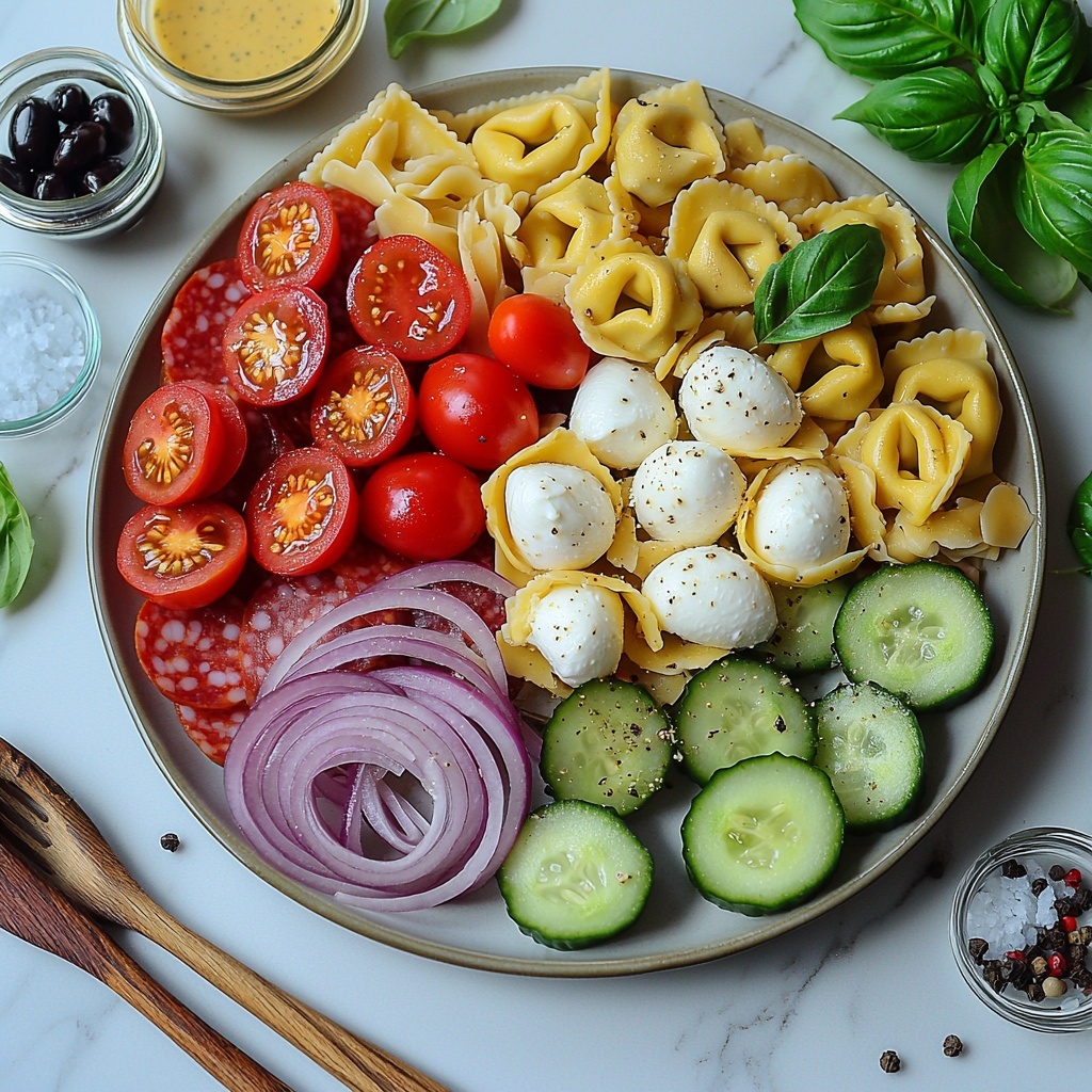 Start by cooking your fresh or frozen cheese tortellini according to the package instructions. Once cooked, drain and rinse them under cold water to stop the cooking process. This step is key so the pasta stays tender but firm and doesn’t turn mushy in your salad. Let the tortellini cool completely before moving forward.
