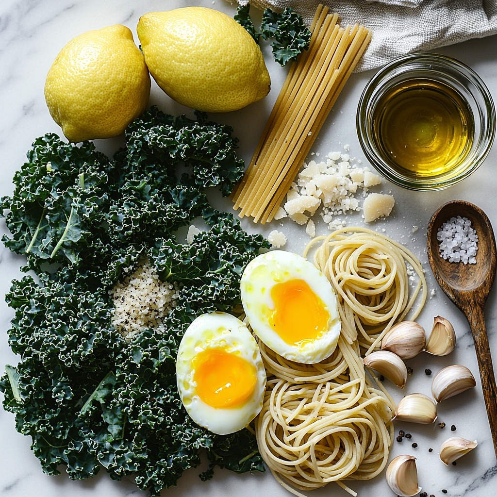 The ingredients for this Lemon Kale Pasta with Fried Eggs Recipe are delightfully simple yet indispensable for creating that layered, fresh flavor profile. Each item plays a significant role in building the dish’s texture, brightness, and satisfying heartiness.