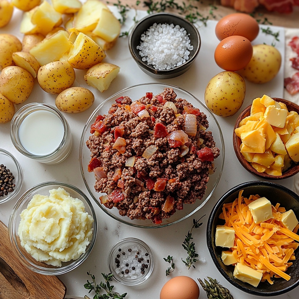 This recipe calls for ingredients that are simple, familiar, and essential to delivering the rich flavors and perfect textures that make the Mashed Potato Meatloaf Casserole Recipe shine. Each item plays a special role, from building the juicy meatloaf base to creating the luscious mashed potato topping that melts into cheesy, bacony goodness.