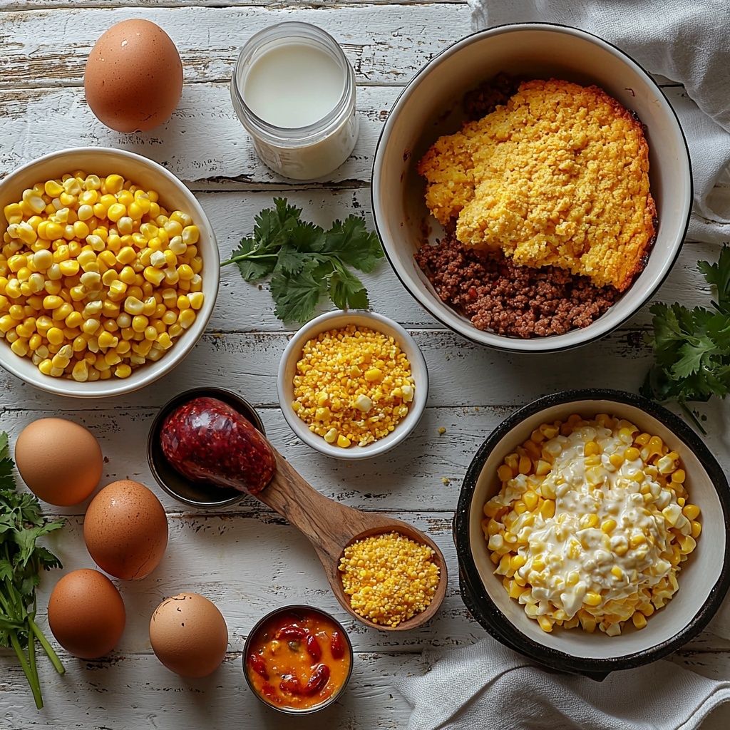 Every ingredient in this Mexican Cornbread Casserole Recipe plays an essential role in crafting the perfect balance of taste and texture, from the savory meat to the rich cheese and the tender cornbread topping. None are complicated, but each one brings a unique touch that elevates this casserole.