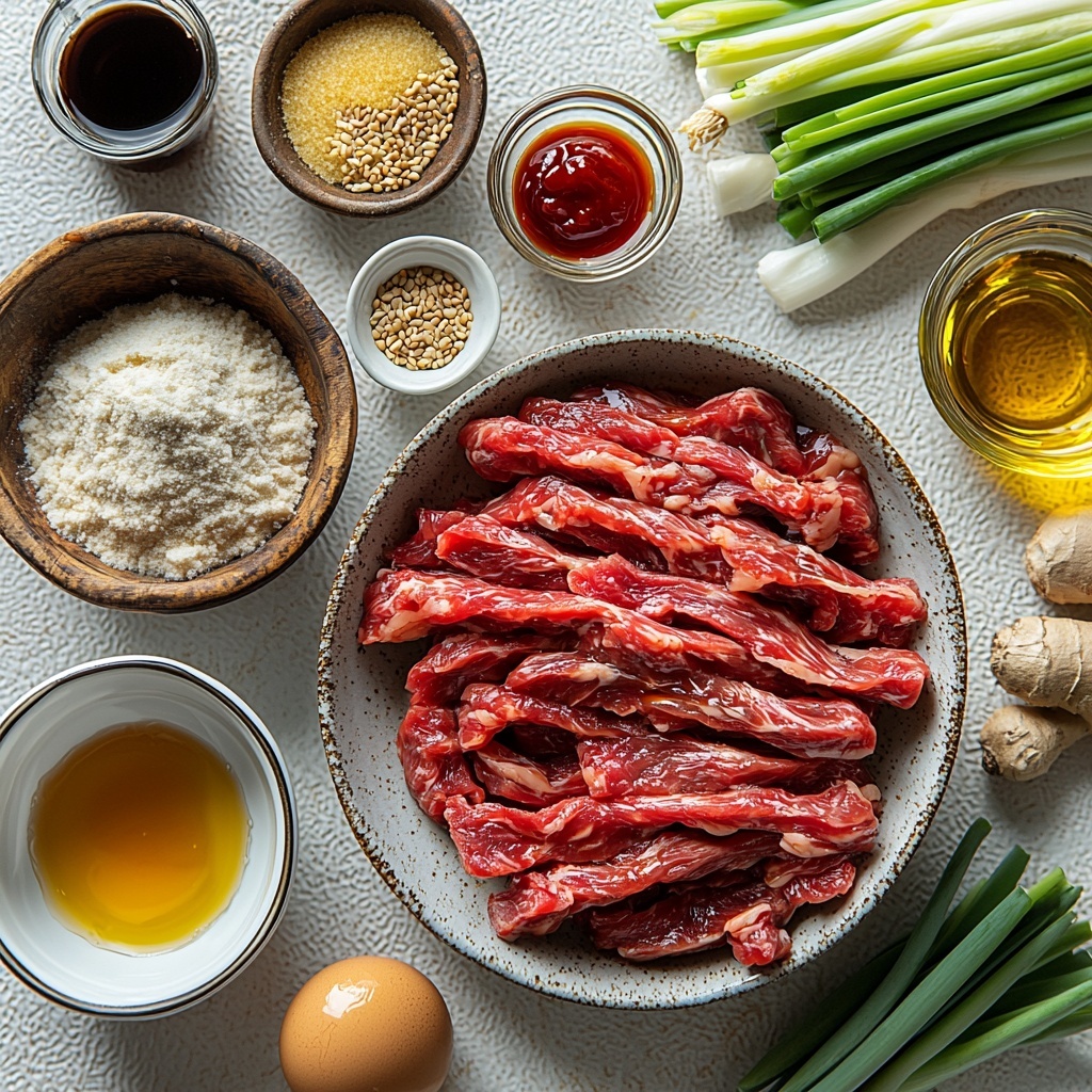 Gathering a handful of straightforward ingredients is all it takes to make this dish shine. Each item plays an essential role, whether it’s giving the beef its irresistible crispiness, adding depth with the savory and sweet sauce, or providing a fresh garnish to finish everything off.