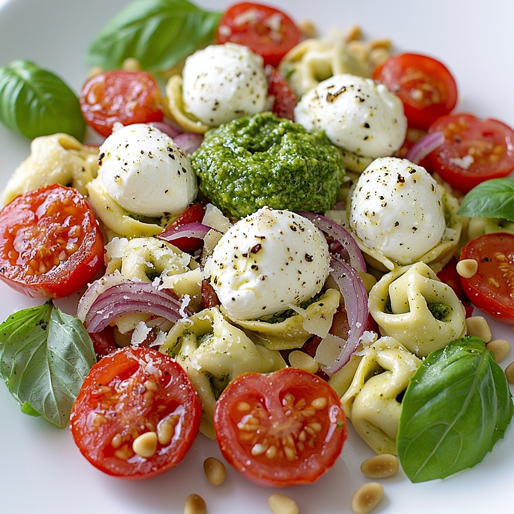 While the tortellini cools, halve your cherry tomatoes, finely dice the red onion for a gentle crunch, drain the fresh mozzarella balls, and roughly chop your fresh basil leaves. Don’t forget to toast those pine nuts in a dry skillet until golden and fragrant—a simple step that packs serious flavor.