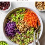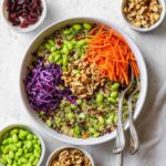 - Add Quinoa, Edamame, and Nuts: Into the bowl with vegetables, add 2 cups of cooked quinoa, the thawed edamame, and the raw unsalted peanuts or cashews.