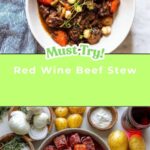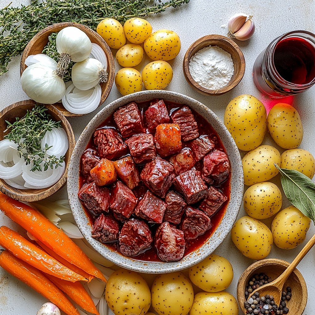A hearty and rich Red Wine Beef Stew featuring tender chunks of beef chuck slow-cooked in a flavorful blend of red wine, beef stock, fresh herbs, and root vegetables. Finished with a savory topping of bacon, pearl onions, carrots, and mushrooms, this classic stew is perfect for cozy meals and gatherings.