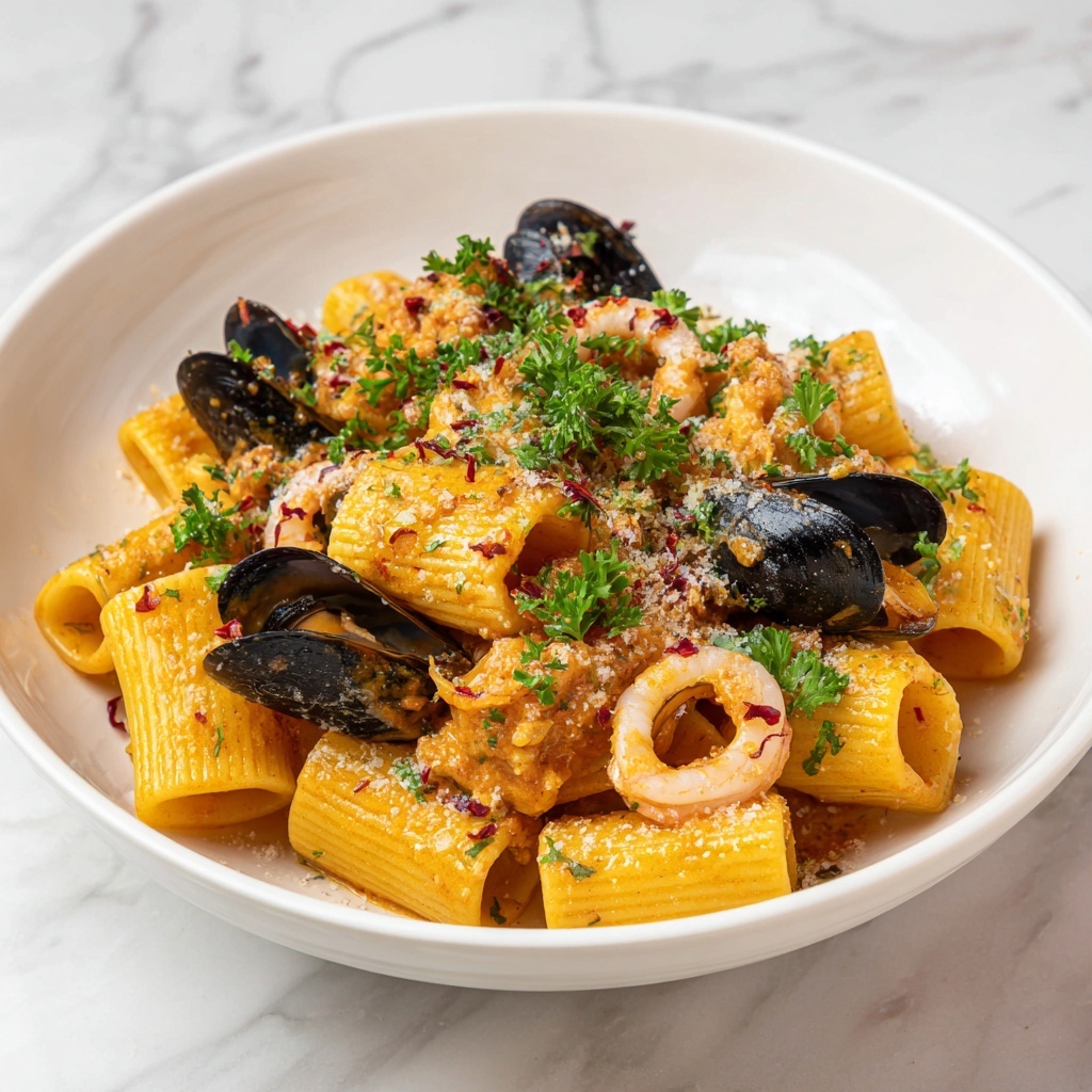 A comforting Italian-style seafood pasta bake featuring a creamy tomato sauce blended with mixed seafood and pasta, topped with melted mozzarella and Parmesan cheeses, then baked to golden perfection.