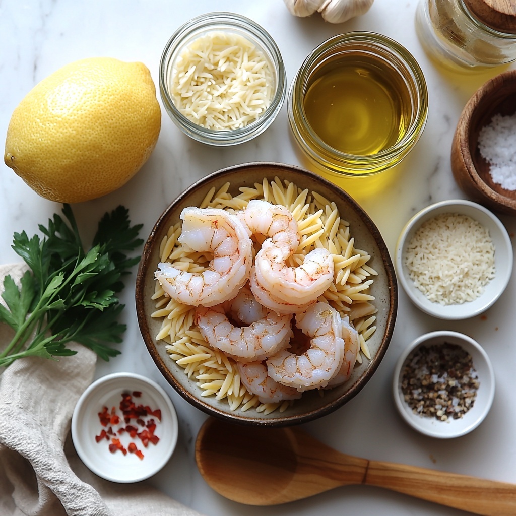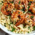 A bright and flavorful Shrimp Orzo in Lemon Garlic Sauce, featuring succulent shrimp sautéed in a fragrant garlic-infused olive oil, tossed with tender orzo pasta, tangy lemon juice and zest, and finished with a touch of Parmesan cheese and fresh parsley. A quick and elegant dish perfect for weeknight dinners or entertaining guests.