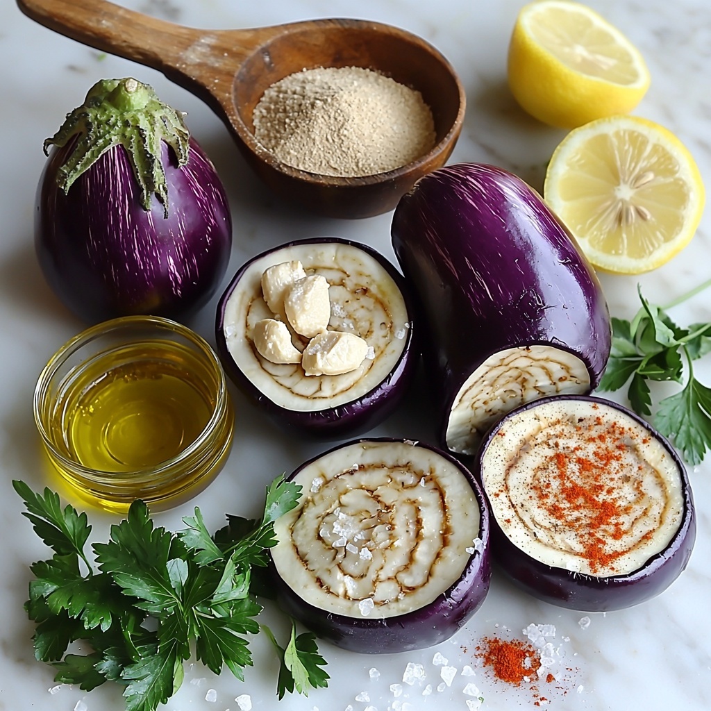 Begin by preheating your oven to 400°F (200°C). Slice the eggplants in half lengthwise, then score the flesh in a crisscross pattern to allow heat and seasoning to penetrate. Drizzle with olive oil and sprinkle salt evenly over the cut sides, helping to draw out moisture and enhance flavor. Position the eggplants cut side down on a parchment-lined baking sheet and roast for 30 to 35 minutes until the flesh is tender and slightly charred, creating a smoky base that defines this dip.