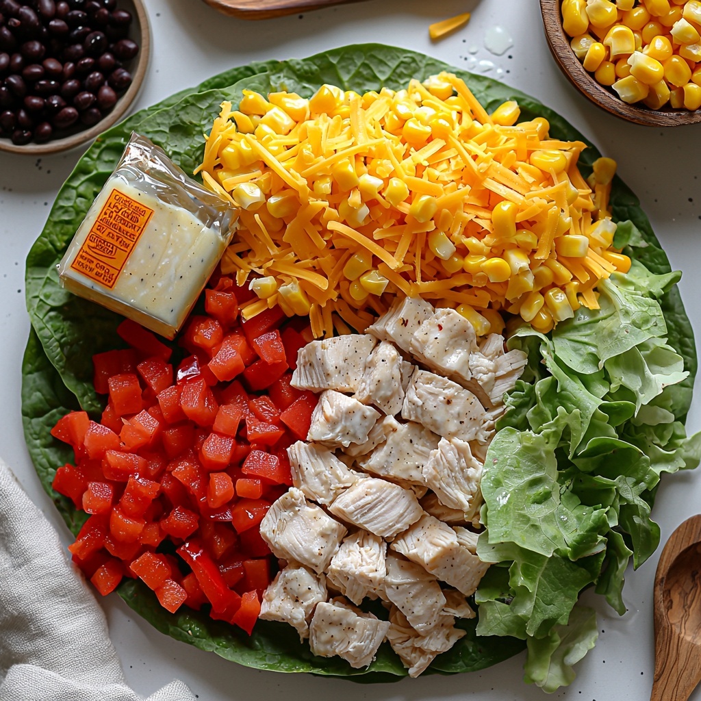 - Assemble the wraps: Lay the spinach tortillas on a clean surface. Evenly distribute the chicken and bell pepper mixture down the center of each tortilla. Top with chopped romaine lettuce, black beans, corn, shredded cheddar cheese, and a generous drizzle of Caesar dressing. Fold the tortillas burrito-style, securing the fillings inside.