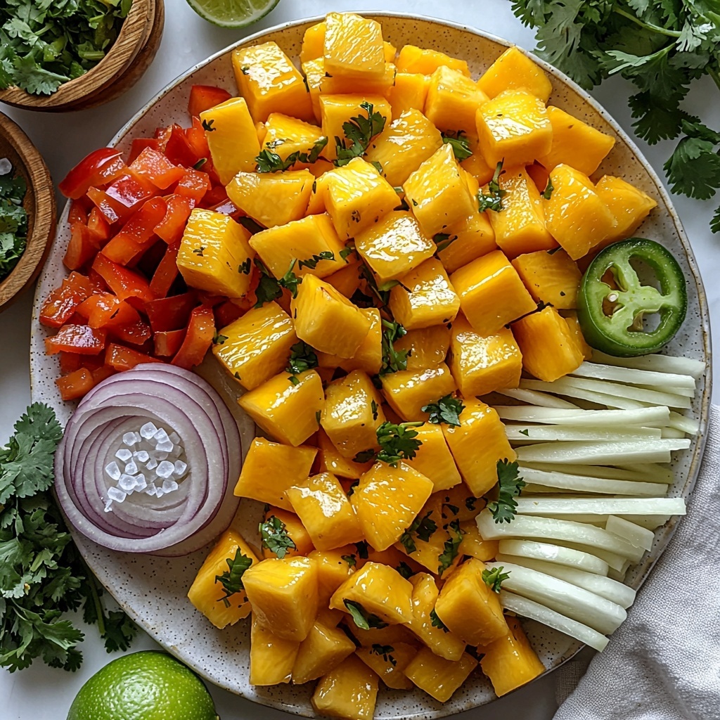 Start with selecting ripe mangoes that yield slightly when pressed, then dice them into bite-sized, manageable pieces. Next, julienne the jicama into thin sticks to complement the mango’s softness with a satisfying crunch. Chop the red bell pepper into small chunks to contribute vibrant color and a sweet touch. Finely dice the red onion for bursts of sharpness, and chop the jalapeño carefully, adjusting the amount based on your preferred spice level. Finally, chop the cilantro finely to distribute its fresh flavor evenly throughout the salad.