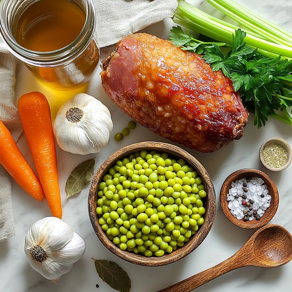 - Prepare Ingredients: Gather all necessary ingredients including green split peas, ham hock, onion, carrots, celery, garlic, bay leaves, and vegetable broth or water.