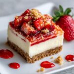 - Slice and Decorate Cheesecake: Remove cheesecake from the fridge and lift it out of the pan using parchment edges. Cut into 16 squares or chunks of desired size. Plate the cheesecake chunks, drizzle each chunk with the cooled strawberry sauce, scatter the strawberry crunch topping generously over the top, and finish by drizzling melted white chocolate in a zigzag pattern. Sprinkle extra crunch on top if desired.
