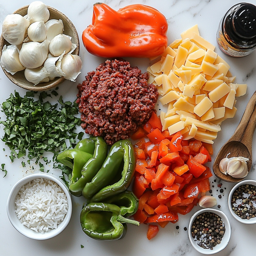 These ingredients are straightforward but essential for creating the comforting, hearty flavors stuffed peppers are known for. Each element plays a specific role: the ground beef adds savory richness, the bell peppers bring freshness and color, and the combination of cheeses ensures that irresistible, gooey finish.
