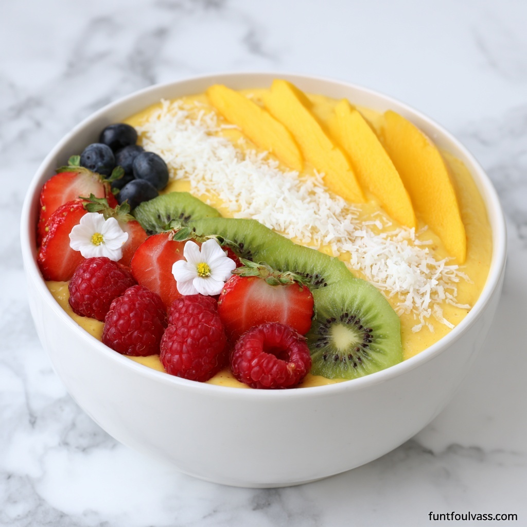 Once you have that beautiful, thick smoothie base, transfer it carefully into your favorite bowl. This part is where the fun really begins because you get to personalize your Tropical Smoothie Bowl Recipe with an assortment of your favorite toppings. Arrange fresh blueberries, raspberries, pineapple chunks, raw coconut flakes, sliced strawberries, kiwi, and a sprinkle of granola right on top. The contrasting textures and vibrant colors make your bowl as delightful to look at as it is to taste.