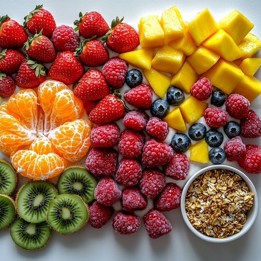 This vibrant Tropical Smoothie Bowl is a refreshing and healthy breakfast or snack option, packed with the natural sweetness of orange, strawberries, mango, and an array of tropical fruits. It blends a creamy, ice cream-like consistency with a variety of fresh toppings including berries, pineapple, kiwi, coconut flakes, and crunchy granola for texture and flavor.