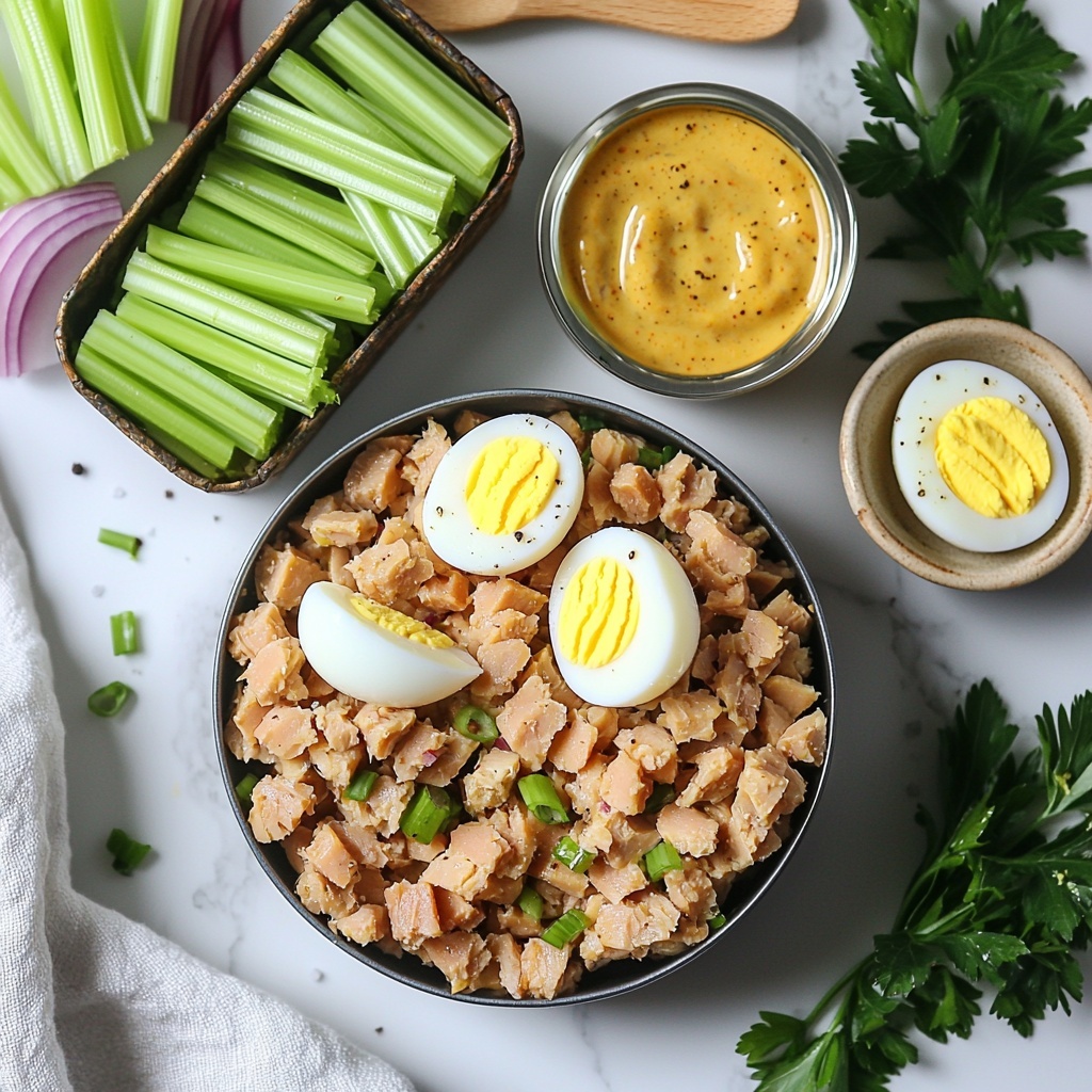 • 4 hard-boiled eggs, chopped: Eggs add richness and a creamy texture that complements tuna beautifully.