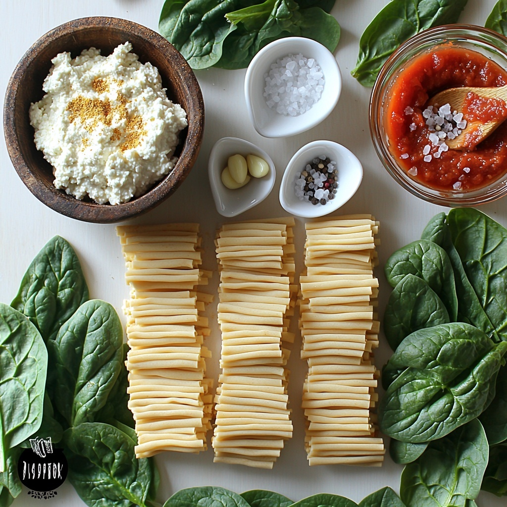 These ingredients come together with simple elegance to build the foundation of the dish. Each one plays a crucial role: from the tender noodles that wrap the filling, to the creamy tofu ricotta that adds lush texture, and the nutrient-packed spinach that brings vibrant color and freshness.