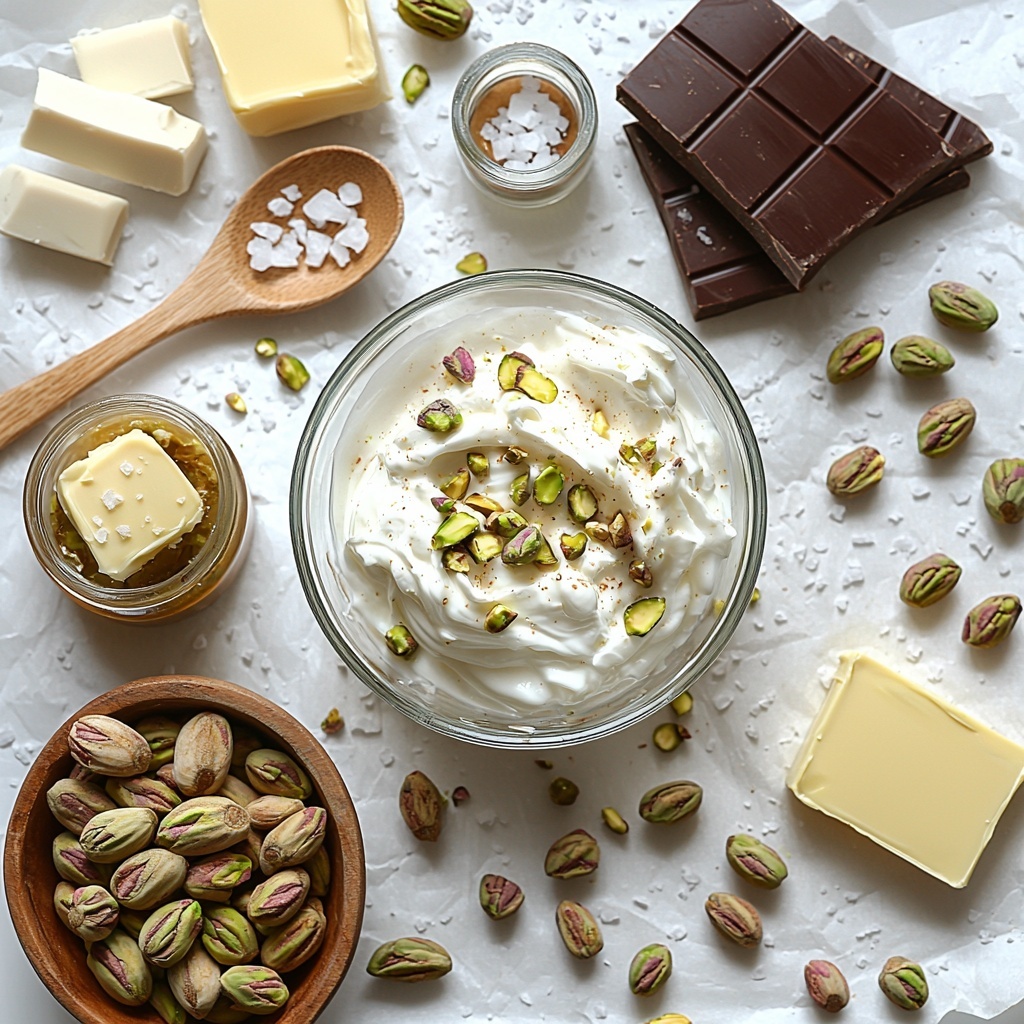 - Make the Topping: Melt the vegan white chocolate and cocoa butter together in a bowl over a water bath. Remove from heat and stir in pistachio butter and finely chopped roasted pistachios until smooth and evenly combined.